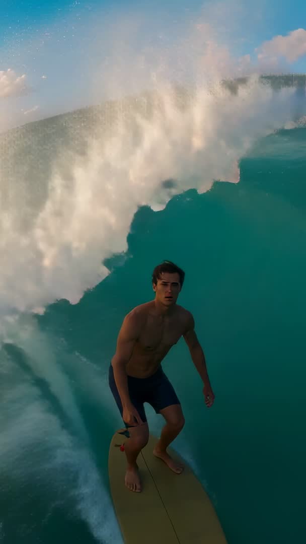 AI Generated Video. Vertical surf video showing shirtless surfer riding inside perfect turquoise barrel on yellow longboard, sunlight filtering through wave lip and water spray framing rider. Camera angle capturing inside-tube perspective and close-up action, conveying speed, balance, and raw ocean power. Footage featuring rich color contrast, dramatic motion, and cinematic composition optimized for mobile viewing. Working well for travel and tourism campaigns promoting surf destinations, using as hero clip for adventure sports brands, or featuring in surf school and equipment ads. Ideal for social media reels, Instagram and TikTok vertical ads, mobile banners, website backgrounds, and video intros for lifestyle or sports channels. Providing options for cropping, slow-motion highlights, and overlaying text or logos for promotional edits.