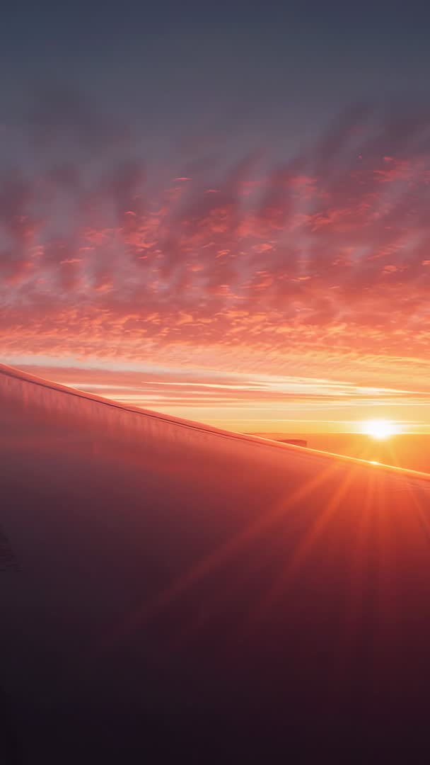 AI Generated Image. Video showing airplane wing at sunrise from window seat, capturing warm orange glow and lens flare across layered cloudscape. Camera held vertically by phone, creating tall mobile-friendly frame ideal for social stories, reels, and short-form content. Light rays spreading toward viewer, creating cinematic silhouette along wing edge and reflective highlights on metal surface. Cloud layers displaying soft pink and purple tones while horizon emits bright rising sun flare. Ideas for use: background for travel vlogs and airline promos, hero clip for mobile website headers, vertical banner for social media ads, calming visual for meditation or wellness apps, transition clip for documentary sequences, stock footage for tourism campaigns or in-flight marketing. Editing tips: apply subtle slow motion, gentle color grading, or overlay text and logos for compelling mobile-first content.