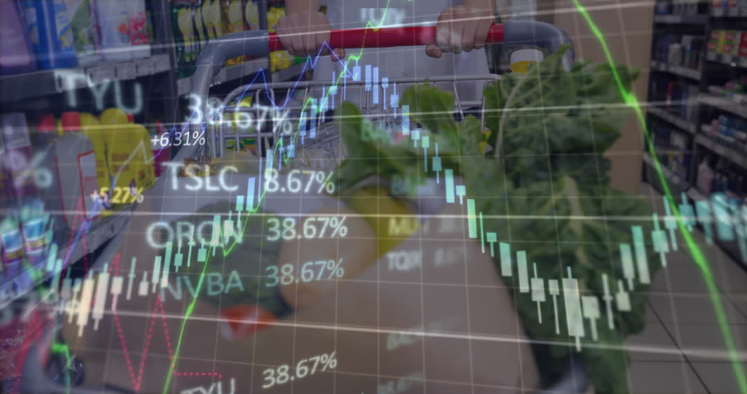 Visual juxtaposition of a casual grocery store scene with fluctuating stock market graphs. This video concept symbolizes the interconnectedness of consumer behavior with economic trends. Perfect for use in articles about retail market analysis, economic predictions, finance and consumer studies or digital modern advertising.