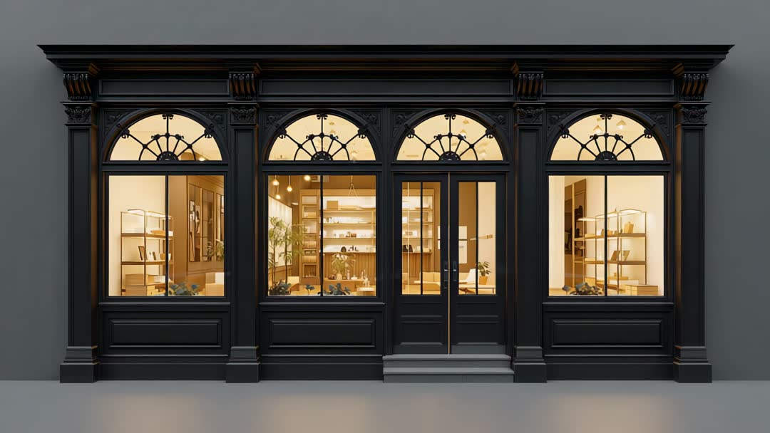 - Showcasing Elegant Black Storefront with Arched Windows and Warm Interior Lighting