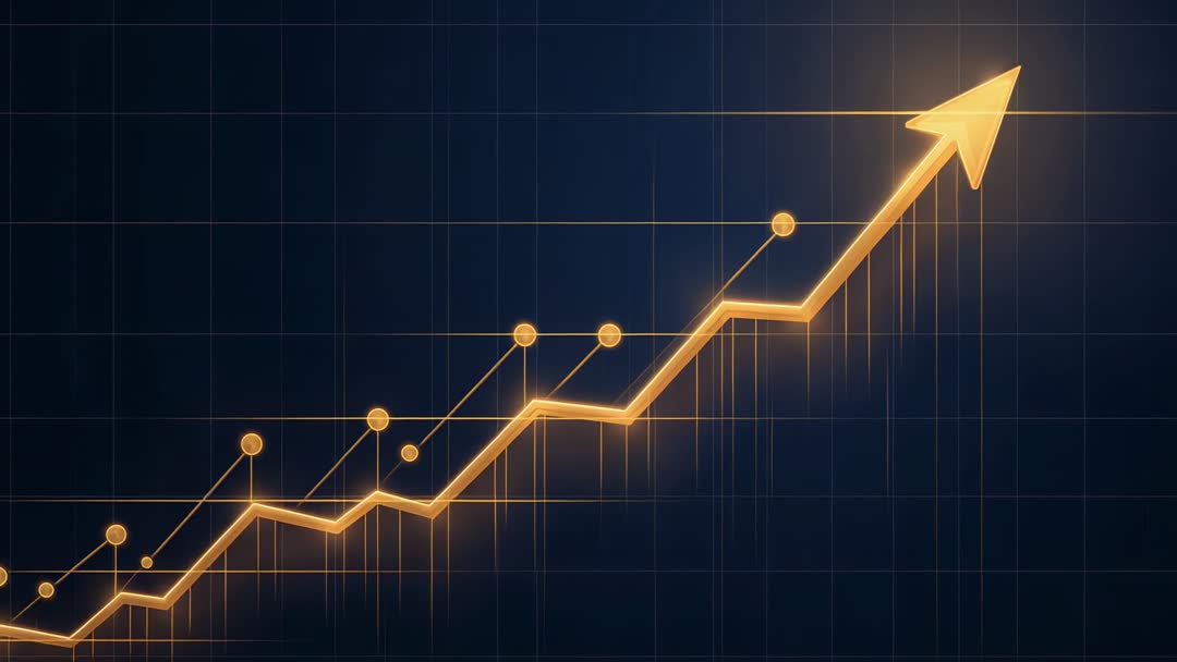 - Showing glowing gold step-line growth chart with rising arrow and data nodes on dark dashboard