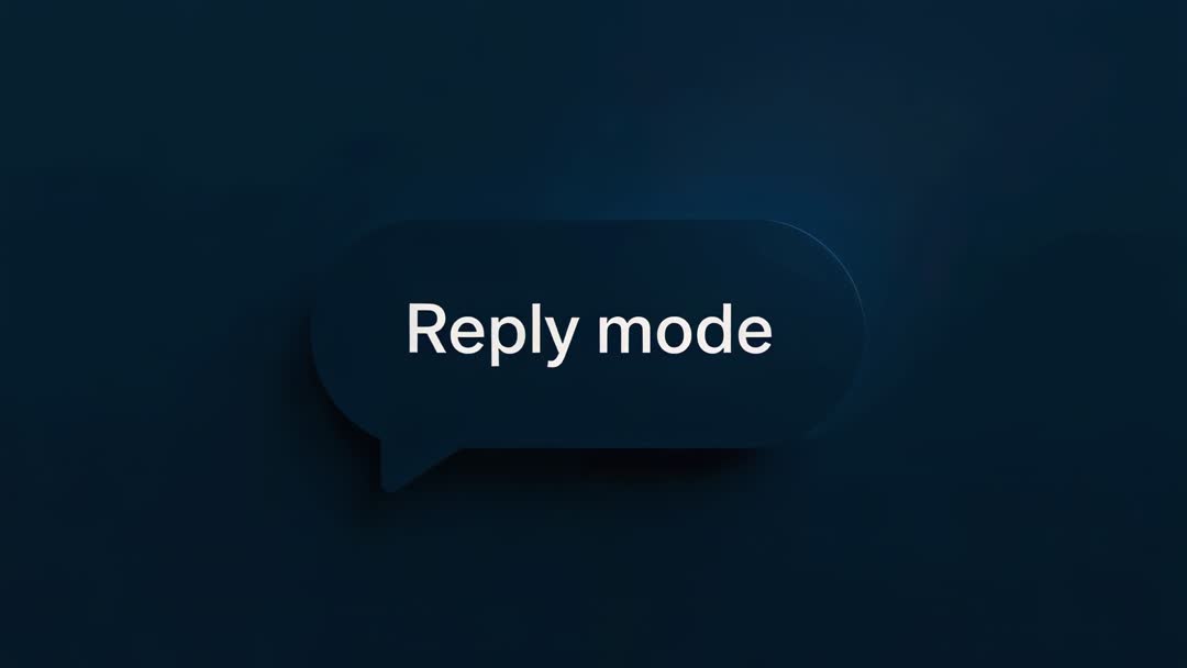 AI Generated Video. Showing rounded speech bubble labeled Reply mode centered on navy-blue gradient background with soft drop shadow. Design featuring pill-shaped bubble, white sans-serif text, subtle bevel, and high-contrast presentation for dark mode interfaces and modern messaging apps. Working well as app tutorial clip, UI demo, onboarding animation, promotional video, product landing hero, blog header, social media ad, or UX presentation focusing on messaging, reply features, or AI chat functionality. Providing ample negative space for overlay copy or logo placement, with centered composition and gentle vignette drawing attention to bubble. Useful for designers and marketers needing clean visual for feature announcement, update notes, in-app prompts, or explainer videos; easily integrating into brand palette or animating with slight pop and fade for engaging microinteraction.