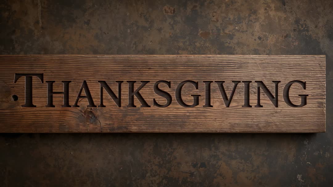 AI Generated Image. Showing close-up studio video of carved serif lettering spelling THANKSGIVING on weathered wooden plaque. Featuring deep carved letters casting crisp shadows across warm brown woodgrain and knot details. Displaying strong horizontal composition with stationary framing and subtle top-down perspective. Providing rich texture and cinematic warmth for holiday campaigns. Working well for website banners, social media ads, email headers, seasonal menus, event invitations, storefront displays, product packaging, and greeting cards. Offering ample negative space above and below for text overlay or logo placement. Complementing rustic, vintage, farmhouse, and artisan brand aesthetics. Serving editorial use, commercial advertising, seasonal promotions, and DIY craft tutorials.