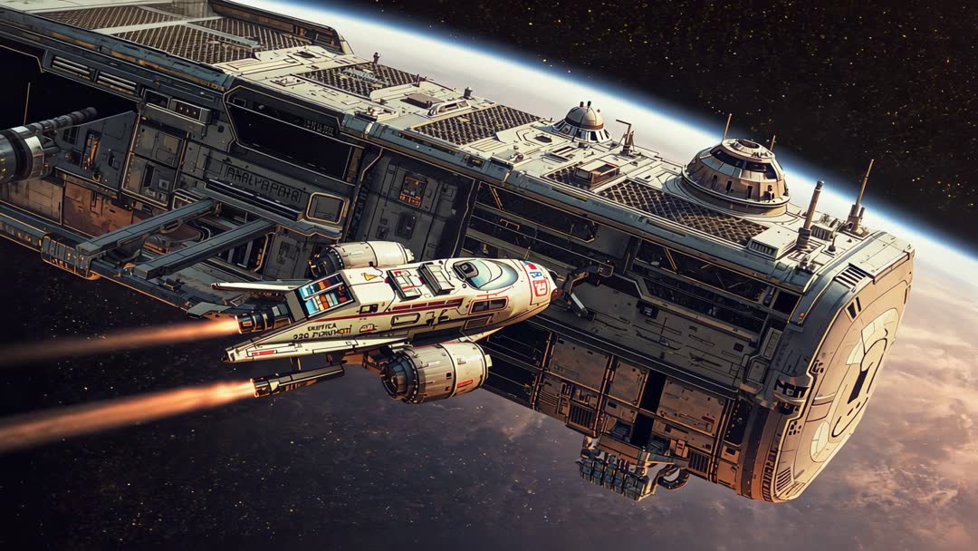 AI Generated Image. Clip showing shuttle aligning for docking with massive orbital cargo module over luminous planet, engines firing and thruster plumes trailing into starfield. Camera panning across detailed station hull, capturing docking bay approach, canopy reflection, panel textures and exterior maintenance bays. Lighting casting warm rim glow from planet horizon, creating cinematic contrast with cold space background. Footage suiting sci-fi trailer, game cinematic, VFX demo, editorial on orbital logistics, classroom explainer on docking procedures, or marketing for space entertainment and technology. Editing suggestions including adding subtle lens flare, scoring with suspenseful synth, using slow push-in for dramatic reveal, or looping short segment for background display.