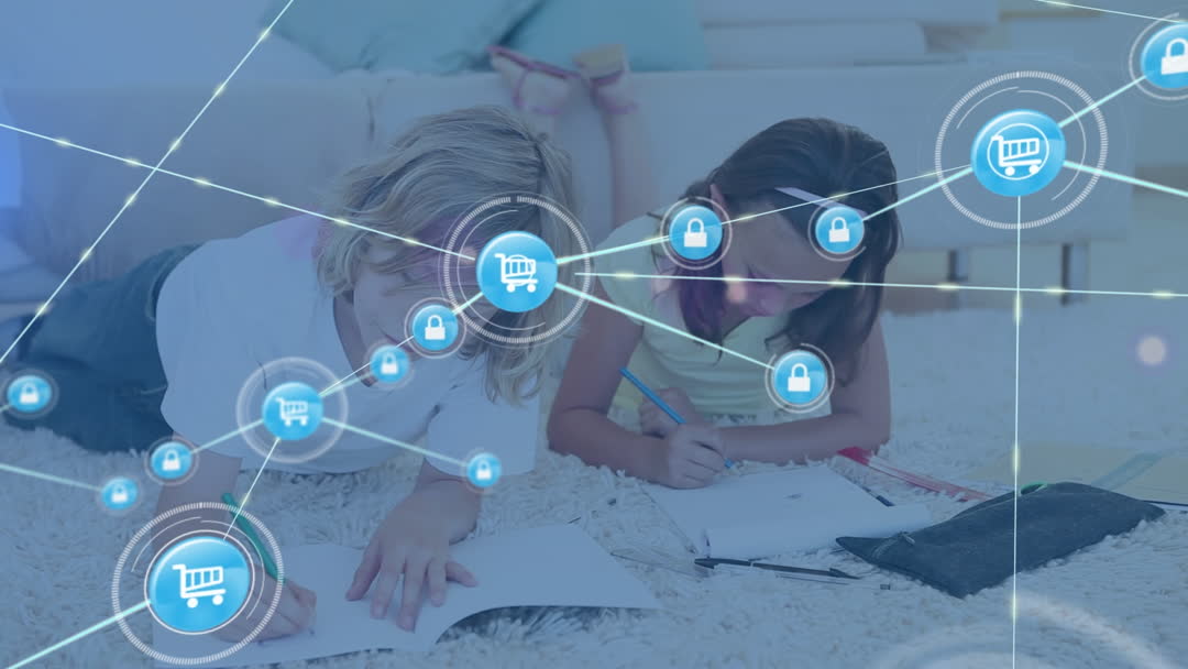 Two siblings studying at home, lying on the carpet and focusing on their notebooks. Overlay of digital network icons and shopping cart symbols illustrates the integration of technology and education. Use this for educational technology or digital learning content, emphasizing family and learning in a modern context.
