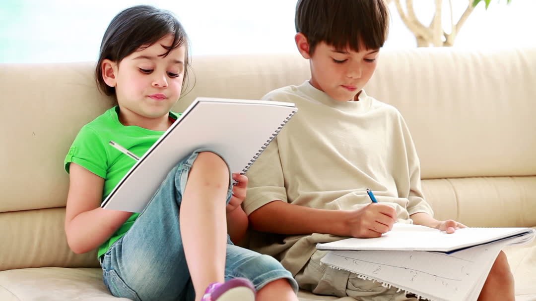 - Siblings Focused on Homework on Sofa in Bright Living Room