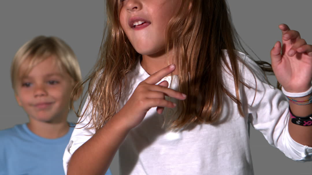 Young boy and girl express happiness while dancing together. The video captures the carefree moments of childhood with the subtle balance of youthful energy and innocence. The soft grey background emphasizes their playful interaction, suitable for use in family-oriented media, promotions for children's clothing, or articles on sibling relationships.