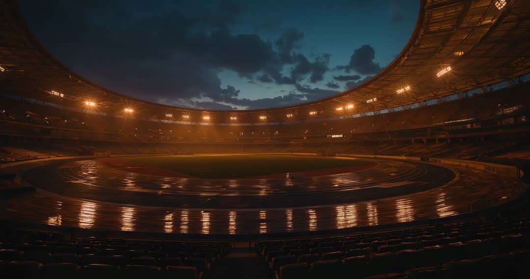 - Silent Stadium at Dusk with Reflections and Floodlights On
