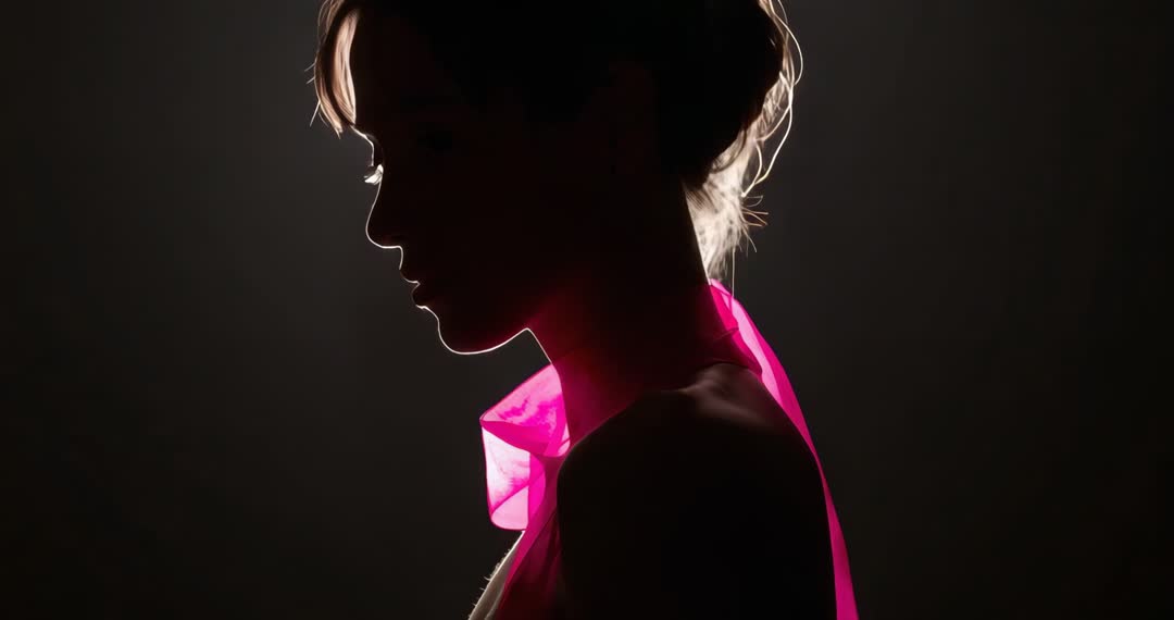 AI Generated Image. This video frame captures the elegant silhouette of a model subtly turning her head against a dimly lit background, with dramatic rim lighting emphasizing a flowing pink scarf. Perfect for use in fashion advertising, artistic projects, and design presentations that require a contemporary and sophisticated aesthetic.