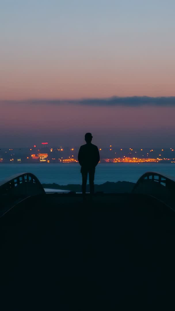AI Generated Image. Vertical video showing man standing on walkway watching dawn over coastal city lights. Silhouette foreground creating dramatic contrast against pastel sky and warm amber city glow. Composition offering ample negative space in upper frame for text overlays, titles, or branding. Color palette blending soft blues, pinks, and orange highlights from distant lights. Footage working well for mobile wallpaper, vertical social media reels, travel promo clips, meditation and mindfulness content, website hero backgrounds, book covers, cinematic intros, corporate mood pieces, and inspirational quote animations. Footage working well as opening shot for short films or storytelling sequences and for time-lapse transitions. Editing suggestions: consider adding slow pan or gentle zoom, overlaying ambient sound or soft piano track, and applying subtle grain for cinematic look.