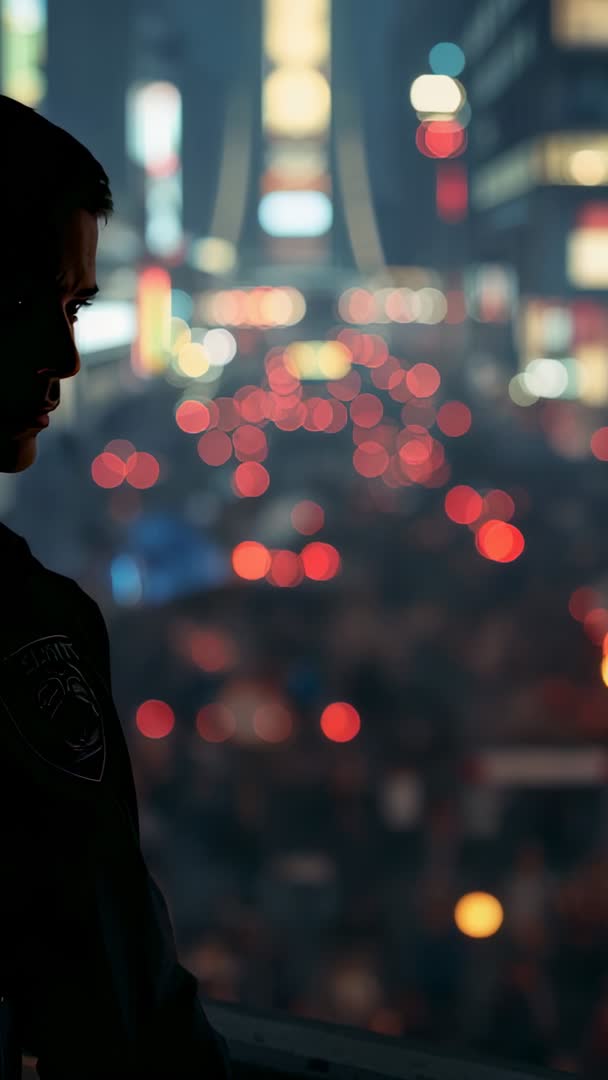 AI Generated Video. Showing silhouette of man leaning on balcony and watching neon-lit traffic and city lights below. Presenting heavy bokeh and neon highlights, creating cinematic night mood and abundant copy space on right side. Suited for vertical social media content, mobile ads, reels, stories, and vertical video platforms. Working well as opener for music video, urban documentary, crime thriller, or brand campaign focusing on solitude and city nightlife. Allowing text and logo overlays on right side; recommending simple sans-serif fonts and light color for contrast. Offering easy color grading for teal-orange or monochrome noir looks. Providing flexible cropping for 9:16 and 4:5 formats and suggesting slow dolly or static hold for pacing. Including usage ideas: background for quote graphics, header footage for websites, promotional reels, mood boards, editorial features about urban life, and cinematic title sequences. Encouraging pairing with ambient electronic or synth soundtrack to amplify atmosphere.
