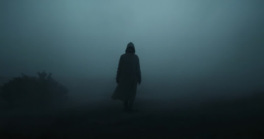 - Silhouette of Cloaked Figure Walking Through Misty Field