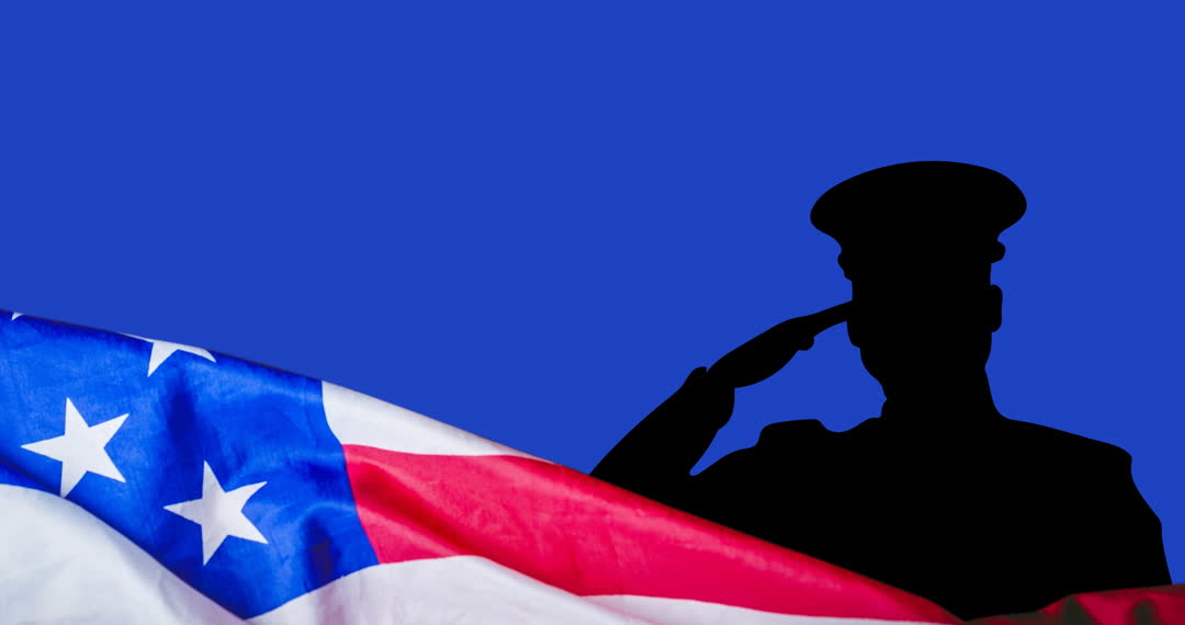 - Silhouette of Soldier Saluting American Flag on Blue Background