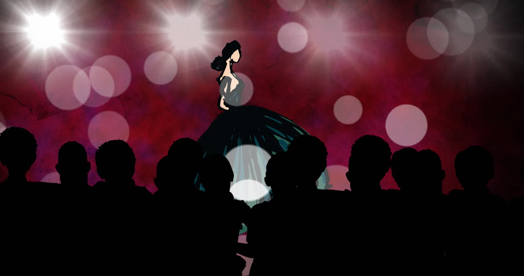 Silhouettes of the audience are watching a glamorous fashion show with vibrant bokeh lights, creating an immersive feeling of style and exclusivity. Use this for promoting fashion events, lifestyle magazines, or illustrating articles about glamorous evenings and high fashion.