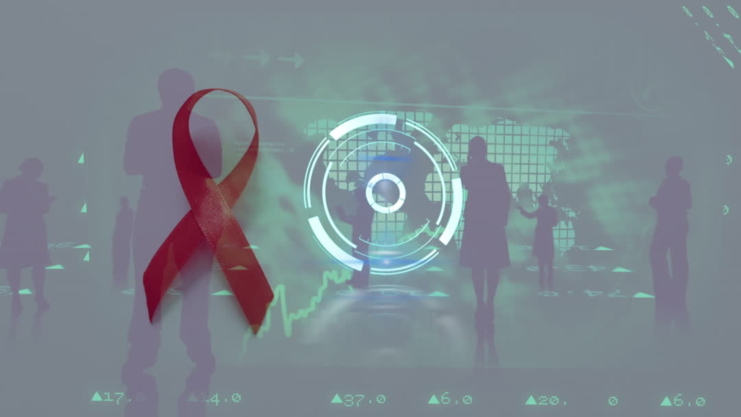 Businesspeople silhouetted against a backdrop of global data visualization symbolizing both technology and communication. Features a prominent red ribbon, often associated with awareness campaigns. Ideal for illustrating concepts in digital security, online networking, global business environments, health awareness campaigns, and technological advancements. Great for presentations, campaigns, and publications on health awareness and data security.