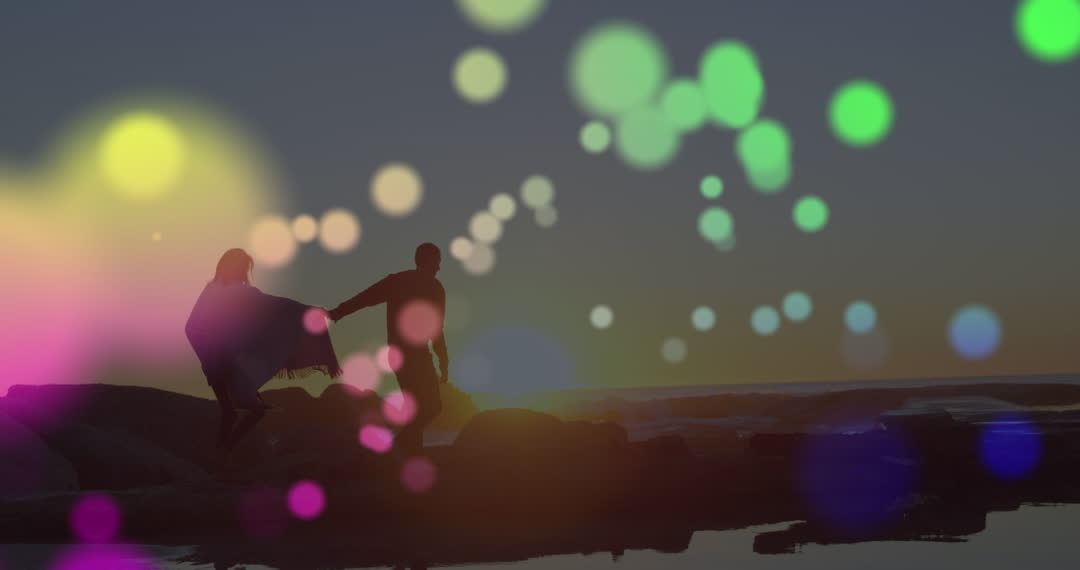 Silhouettes of a couple holding hands are walking along rocky terrain near the ocean at sunset, with vibrant colorful bokeh lights adding extra magic. Ideal for use in romantic or adventure-themed content, travel promotions, lifestyle blogs, and art projects depicting love and scenic beauty.