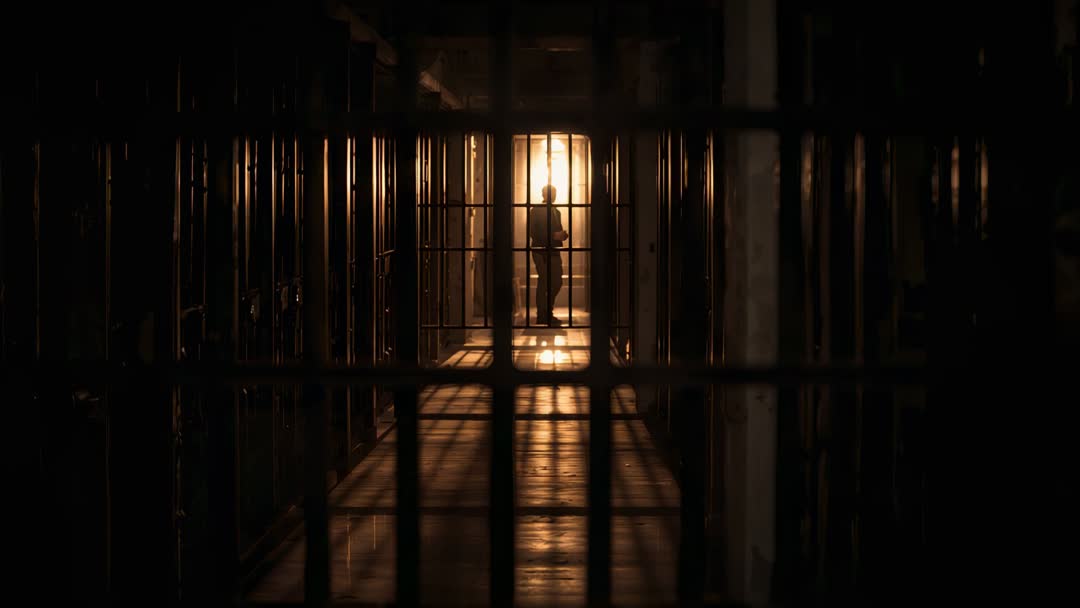 - Silhouetted figure standing in backlit cellblock corridor with long shadows, moody prison footage