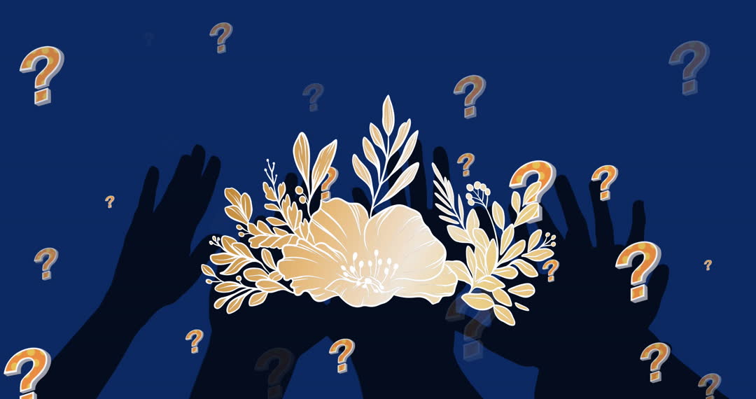 Illustration features silhouetted hands reaching toward ornate floral elements with a backdrop of question marks. The dark blue background provides a striking contrast to the golden flowers, signifying curiosity and mystery. Useful for visual themes related to digital concepts, creativity, and problem-solving, this artwork can be ideal for presentations, blogs, or educational materials addressing topics of discovery, inquiry, or the celebration of culture and artistry.