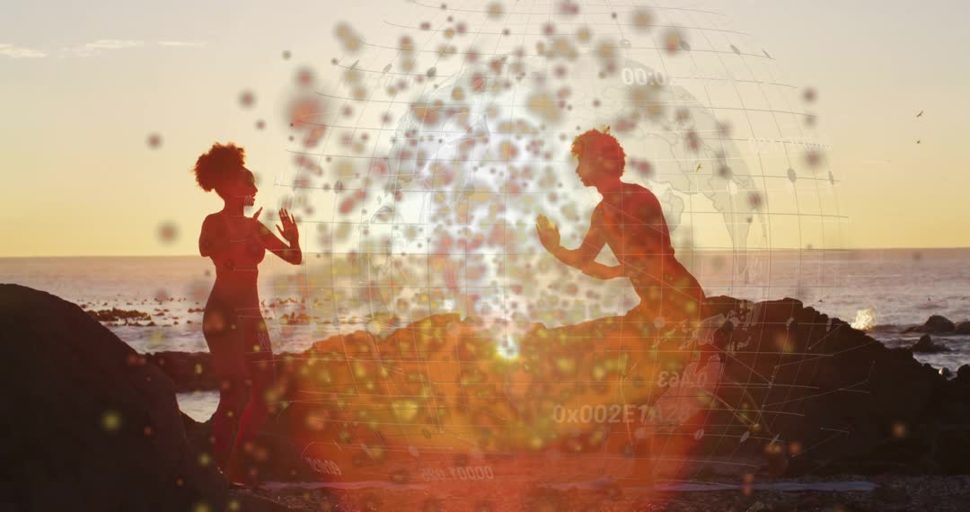 - Silhouetted Pair on Beach with Digital Data Overlay at Sunset
