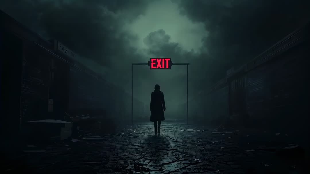 AI Generated Image. Video showing silhouetted woman walking toward glowing red EXIT sign down foggy cobblestone alley under stormy sky. Backlit silhouette casting long shadow across cracked cobbles; neon EXIT sign glowing vivid red against teal fog, creating stark color contrast and deep mood. Scene evoking suspense, isolation, urban decay, and mystery with low key, film-noir aesthetic. Useful for thriller trailers, noir television spots, book or album trailers, escape room advertising, dark fashion promos, cinematic title sequences, and website hero banners. Composition leaving generous negative space above sign for headline or logo overlay; dark foreground allowing bright lower-third graphics or subtitles. Color grading guidance: boosting teal shadows, preserving saturated red in sign, adding soft vignette for added focus and cinematic atmosphere.