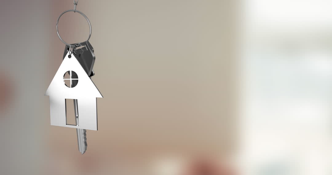 This stock video represents the concept of home ownership, real estate, and security. It features a silver house-shaped key fob with a key dangling against a blurred interior backdrop, ideal for concepts related to buying a home or property security. It can be used in advertisements for real estate, online blog posts about home buying, investment feature articles, or symbolic representations in presentations related to property and ownership.