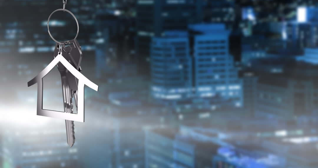 - Silver House Key with Cityscape Background Highlighting Ownership