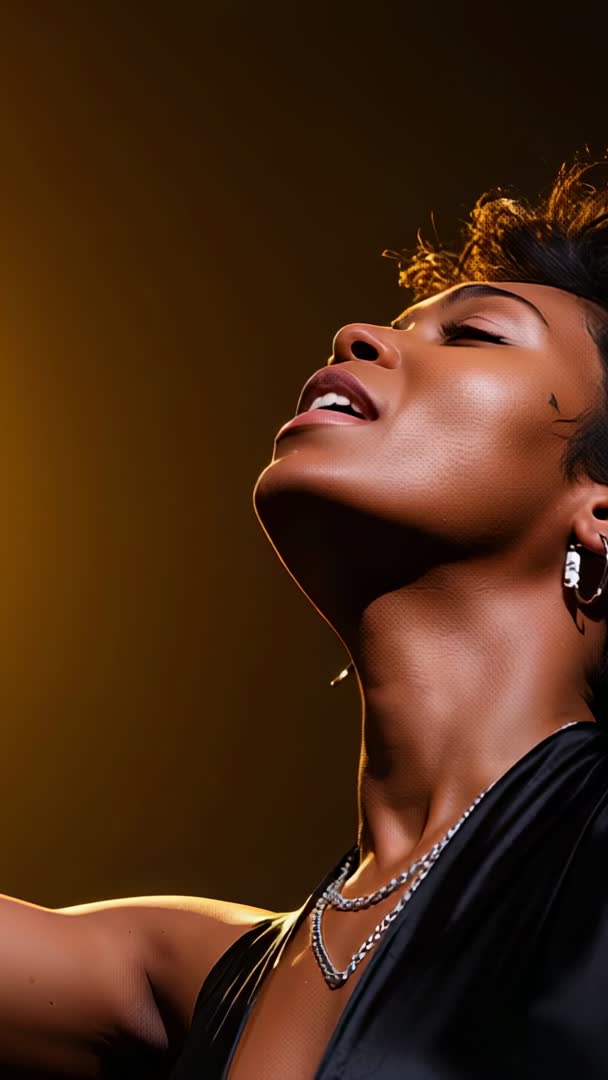 AI Generated Video. Singing with head tilted back while holding sustained note under warm amber halo spotlight. Closeup portrait emphasizing jawline, neck, skin texture, and layered chains. Vertical orientation making clip ideal for social reels, stories, and mobile-first platforms. Using dramatic side lighting to create cinematic mood and strong contrast against dark background. Perfect for music promotion, artist profile pages, concert trailers, streaming thumbnails, beauty and jewelry campaigns, vocal coaching tutorials, and editorial features on performance and emotion. Leaving copy space on left for headlines, logos, or text overlays.