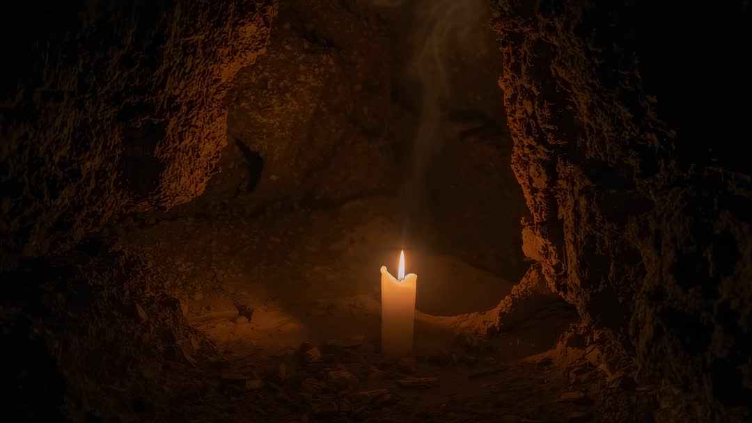 AI Generated Image. Video showing single candle burning inside small stone alcove, flame flickering and smoke drifting upward while casting warm amber light across textured rock walls. Camera holding steady close-up then slowly pulling back to reveal rough cave walls and scattered stone rubble, creating intimate and moody atmosphere. Footage working well for scenes of meditation, ritual, remembrance, solitude, historic or archaeological context, and dramatic cinematic moments. Using for background footage in documentaries, film and TV, spiritual or memorial segments, wellness and candle product promos, website hero banners, social media reels, and atmospheric title sequences. Clip looping smoothly for ambient backgrounds and overlays; longer cut providing slow-paced content for transitions in mystery or horror projects. Color grading suggestions: boosting warmth, deepening shadows, preserving low-key contrast to enhance glow. Audio pairing suggestions: using soft ambient hum, gentle wind, distant drip, or silence for contemplative mood. Deliverables suggestion: providing MP4 or MOV H.264 files for web use with optional looped export for seamless playback.