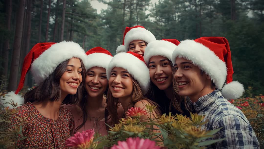 - Six Friends Celebrating Festive Joy in Nature With Santa Hats