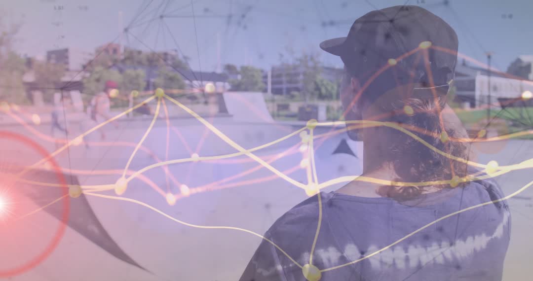 An individual stands in a vibrant urban skate park as a futuristic technology network overlay highlights the blend of sport and digital connectivity. Ideal for promoting themes related to urban lifestyle, technology evolution in sports, or artistic visual expressions showcasing sport and technology integration.
