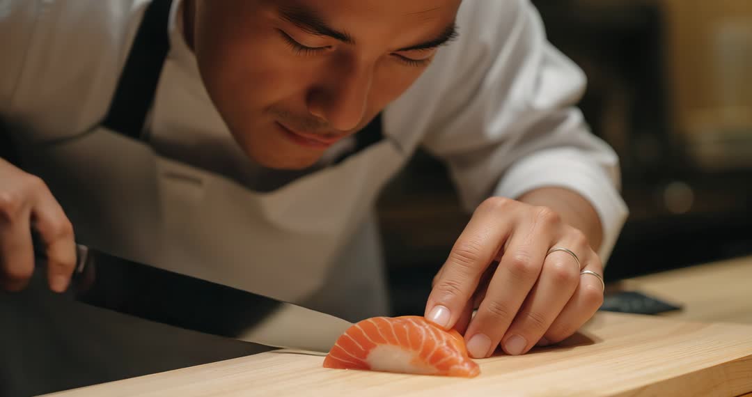 AI Generated Image. Sushi chef demonstrates skill by precisely slicing salmon to assemble nigiri on cutting board. Perfect for content on culinary techniques, professional cooking, or gourmet storytelling. Highlights artistry in culinary practices.