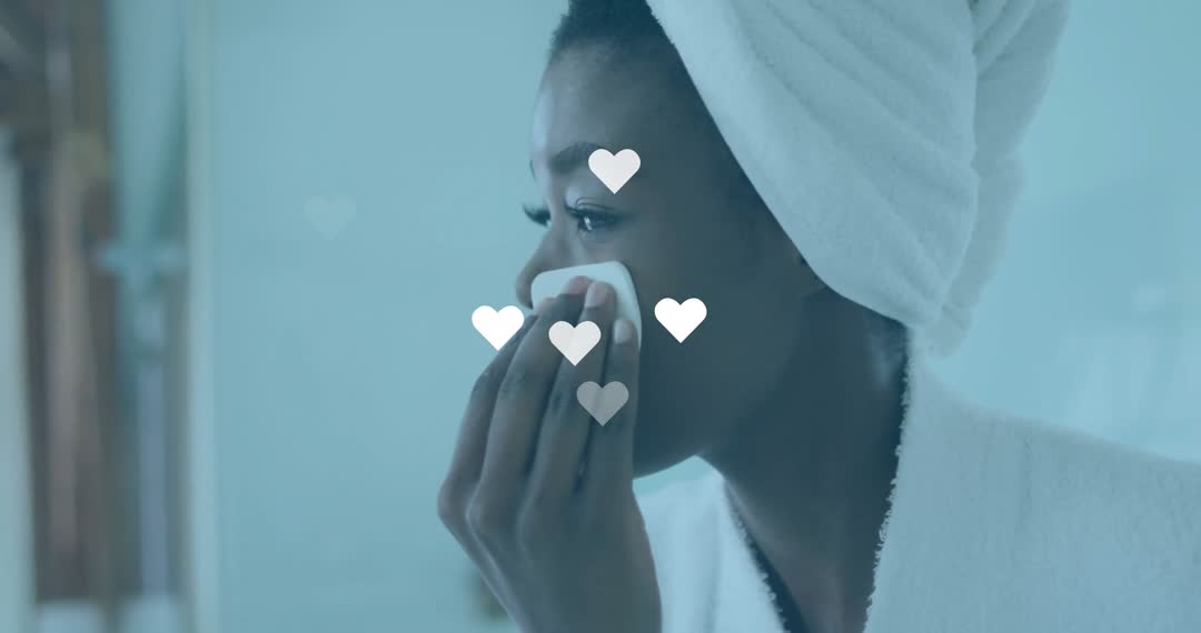 This scene captures an African woman engaged in a cleansing routine at a bathroom mirror. Towel wrapped around her head, she appears focused and serene. Animated hearts surrounding add a playful, warm touch. Suitable for content related to skincare, beauty tutorials, self-care routines, or wellness promotion.