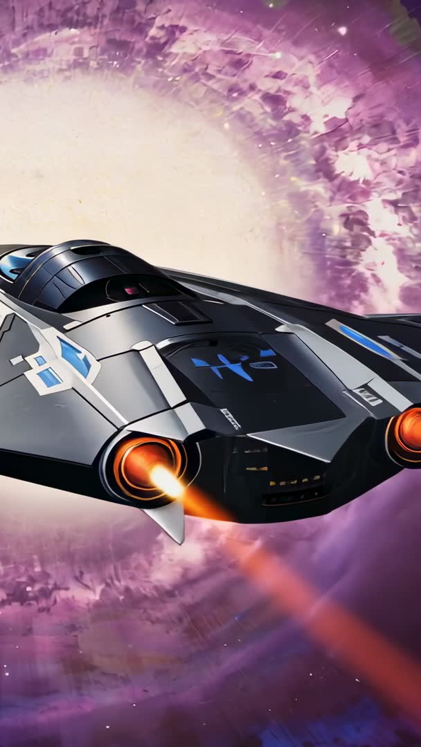 AI Generated Video. Vertical 9:16 clip showing sleek starship igniting twin rear thrusters while racing into luminous wormhole within purple nebula. Low-angle framing emphasizing aerodynamic hull, glowing exhaust, and motion streaks for cinematic sense of speed. Color palette featuring violet and magenta hues with bright central light creating strong contrast and depth. Perfect for sci-fi trailer openers, mobile game promos, app hero backgrounds, social media reels, vertical ads, streaming channel intros, VFX comps, and futuristic brand campaigns. Licensing-friendly asset working well for motion design, title sequences, and editorial on interstellar travel, space exploration, and future technology. Suggested enhancements including adding subtle camera shake, lens flare, and layered sound design for engine roar and whoosh effects to boost immersion. Delivering ready-to-use vertical footage for storytellers, developers, and marketers focusing on high-energy space sequences.