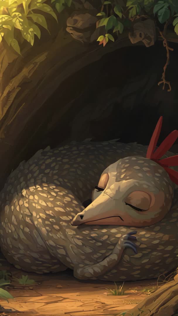 AI Generated Image. Depicting sleeping bird-like creature curled within root cave under warm waning sunlight, creating tranquil and cozy mood. Soft dappled light and earthy tones emphasizing camouflage and peaceful habitat, inviting calm and wonder. Working well for nature documentary opener, fantasy short film scene, children's bedtime animation, meditation app background, vertical social media reels and storytelling ads. Allowing editors to crop and animate for vertical streaming, adding gentle music and subtle sound design for immersive atmosphere.