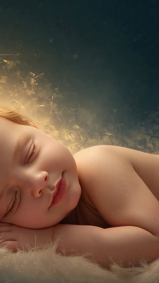 AI Generated Image. Video showing sleeping newborn resting on soft fur rug, chest rising gently under warm golden sparks and soft bokeh glow. Close-up framing capturing delicate skin, long eyelashes, and relaxed expression, creating intimate, calming mood. Lighting emphasizing warmth and softness, with subtle spark particles adding dreamy, magical feel. Use for newborn announcement videos, lullaby or relaxation content, parenting blogs, baby product advertising, maternity or hospital promotions, social media reels, and calming app backgrounds. Suggest editing tips: add soft piano music, slow crossfade transitions, and warm color grading to enhance cozy atmosphere.