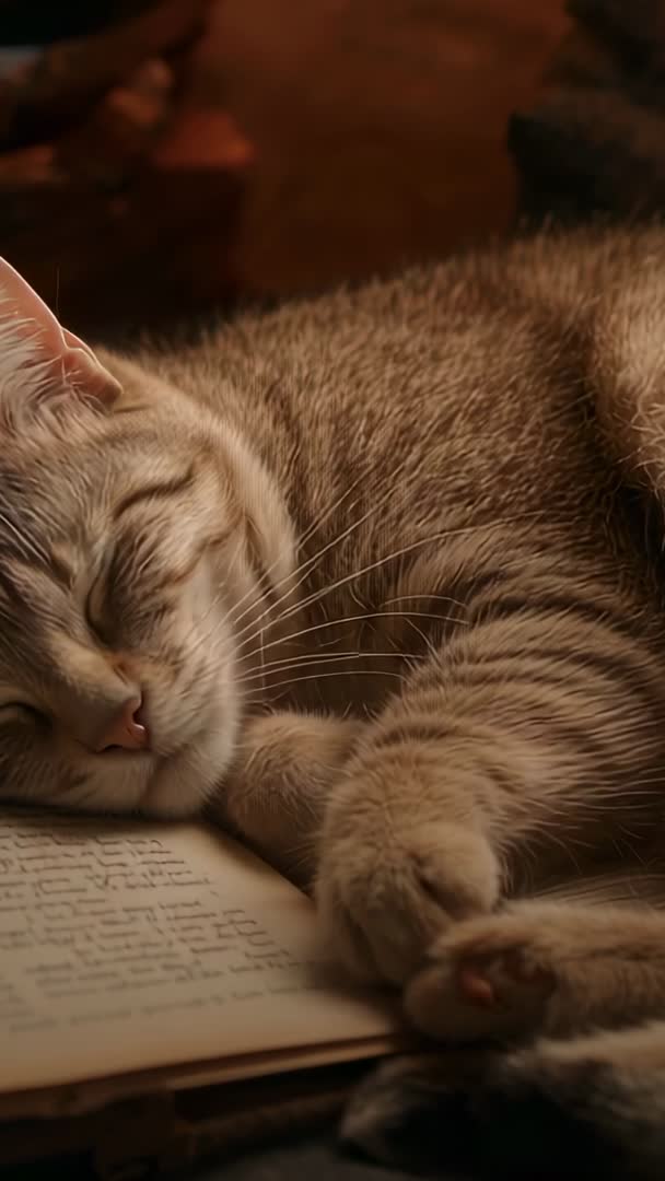 AI Generated Image. Vertical video showcasing sleeping tabby cat resting head on open book while soaking up warm lamp light. Close-up shots highlighting soft fur, whiskers, and relaxed paws with warm color palette creating cozy, intimate mood. Offering crop-safe vertical framing for mobile, loop-friendly composition with low motion for short clips. Pairing with soft ambient music or subtle page-turn sound effects to enhance calm atmosphere. Use for social media reels, bookshop or library promotions, pet care brand storytelling, blog headers about reading and relaxation, greeting cards, meditation or sleep app backgrounds, in-store displays, or editorial pieces about pets and home comfort.