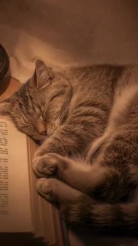 AI Generated Video. Showing sleeping tabby cat resting head on open book, curled paws tucked against soft blanket and bathed in warm amber lamp glow. Vertical video framing offering intimate closeup of fur texture, open pages, and lamp light, conveying calm, comfort, cozy reading nights, and pet companionship. Working well for social media stories, mobile ads, blog headers, bookshop or library promotions, pet care campaigns, home decor features, and relaxation content. Editing suggestions include adding soft ambient soundtrack, applying slow pan or subtle zoom, warming color grade, and placing minimalist text overlay for quotes or product messages. Featuring warm low light, soft shadows, closeup composition, and natural fur detail, making this clip suitable for vertical-first platforms like Instagram Reels and TikTok.