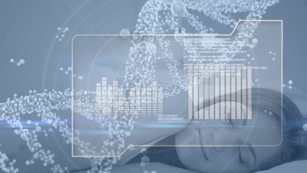 This visualization features a sleeping caucasian woman with a digital overlay of DNA strands and data analytics, symbolizing the intersection of science and tranquility. It suggests themes of genetic research and healthcare innovation. Perfect for use in articles about genetics, technology in health, or showcasing advancements in biometric data analysis and wellness research.