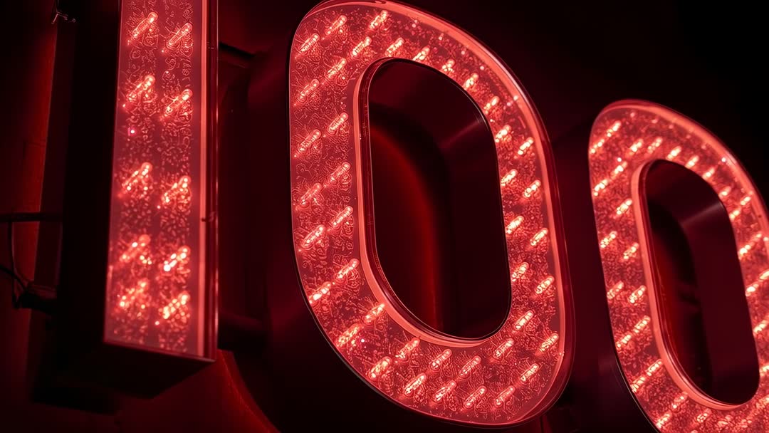 AI Generated Image. Video clip showing camera sliding right and zooming in on red LED 100 sign mounted on dark panel. Closeup revealing LED bulb grid, patterned acrylic face, and warm red glow casting soft reflections. Diagonal composition and shallow depth of field creating cinematic, moody look with strong contrast and saturated color. Useful as loopable background for nightlife and entertainment promos, countdown or milestone sequences, retail or signage advertising, tech product intros, and music video transitions. Recommended uses include motion graphic overlays, animated title reveals, social media ads, website headers, broadcast lower thirds, and creative b-roll for urban or retro-themed projects. Suggested post production techniques: color grading to enhance red tones, subtle vignette and film grain for texture, and masking for integrated text or logo animation.