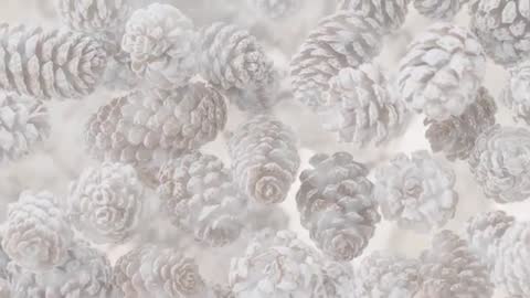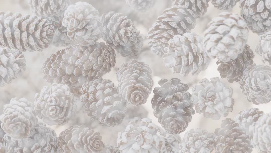- Sliding camera revealing frost-dusted pine cones with shifting focus and parallax motion