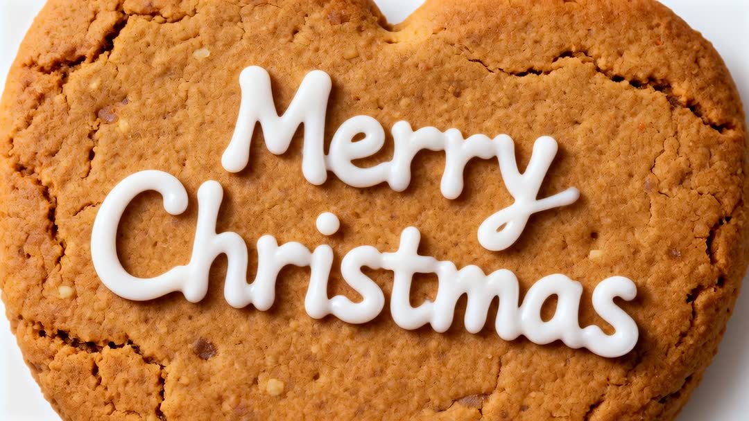 AI Generated Video. Sliding camera revealing heart-shaped cookie with 'Merry Christmas' white icing on white plate, closeup capturing crumb texture, frosting detail, and golden-brown pastry surface. Clip showing slow left-to-right pan, ideal for short loop or hero banner. Working well for holiday marketing, bakery social media posts, greeting card animation, recipe video intro, festive website header, and product packaging mockup. Editing suggestions: applying warm color grade, adding soft vignette, using shallow depth of field, overlaying holiday music and animated text call-to-action in lower third. Deliverable recommendations: exporting 4K or 1080p MP4, creating 4-8 second loop, providing transparent lower third for overlay. Licensing note: suitable for commercial use; no model release required.