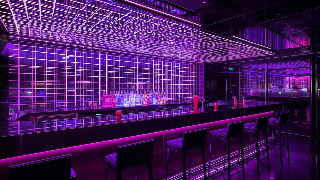 - Sliding camera revealing neon nightclub bar with LED grid, reflective counter and bottles