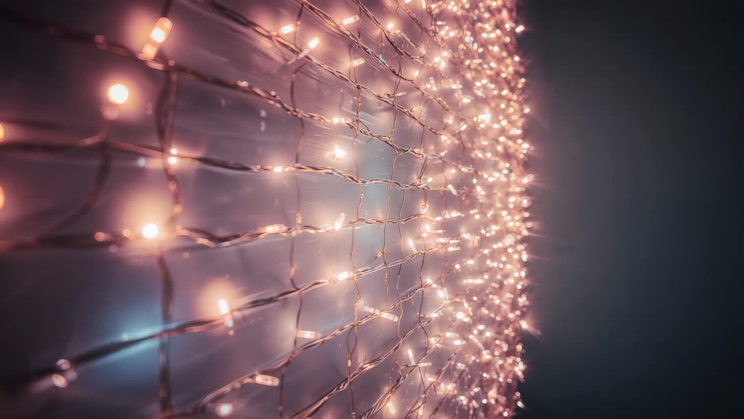 AI Generated Video. Video showing sliding camera revealing net-style warm white LED fairy lights arranged on wall, creating warm amber glow and soft bokeh highlights against cool blue background. Shallow depth of field and close-up grid perspective producing cinematic reveal and twinkling motion ideal for looping backgrounds. Useful for marketing videos, holiday and event promos, social media reels, music video overlays, product showcases, and interior decor content. Editors adjusting color grading to enhance warm-cool contrast or applying slow motion for smoother reveal. Suitable for banners, hero sections, title overlays, mood boards, and background loops for web or broadcast projects. Includes natural lens flares and soft glow, perfect for adding atmospheric warmth to scenes. Rights model: property only, no people present.