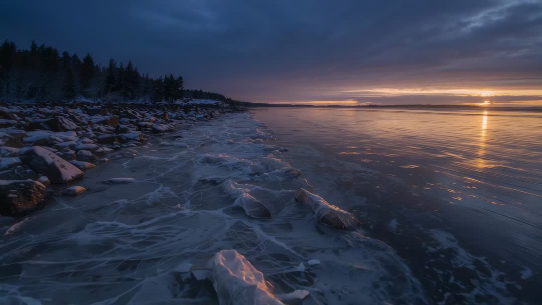 AI Generated Video. Camera sliding along frozen rocky shore, revealing sun rising over horizon and golden light reflecting across icy water and wet stones. Coastal forest silhouettes framing left side while cloudscape adding dramatic contrast to warm sunrise tones. Useful for opening shot in travel video, background for website hero, cinematic cut in nature documentary, social media teaser, seasonal advertising, or mindfulness and meditation content. Editing tips: enhancing warm highlights while preserving cool shadows, applying slow pan and subtle speed ramping for cinematic motion, adding gentle ambient sound with wind and distant surf, creating seamless loop with soft crossfade. AI-generated clip offering stylized cinematic mood and high visual impact.
