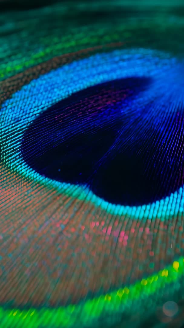 AI Generated Image. Showing sliding camera revealing iridescent peacock feather eye resting on tabletop. Vibrant blue and green barbules reflecting light, creating shimmering radial pattern and fine texture. Tight macro framing and shallow depth of field producing soft bokeh and abstract color fields. Use for vertical social media reels, mobile wallpapers, homepage backgrounds, luxury product displays, textile and surface pattern design, editorial spreads, nature documentaries, educational content on structural coloration. Suitable for branding, packaging, meditation apps, interior decor prints, and digital art overlays. Video loop working well as animated background or visual accent for presentations and promos.