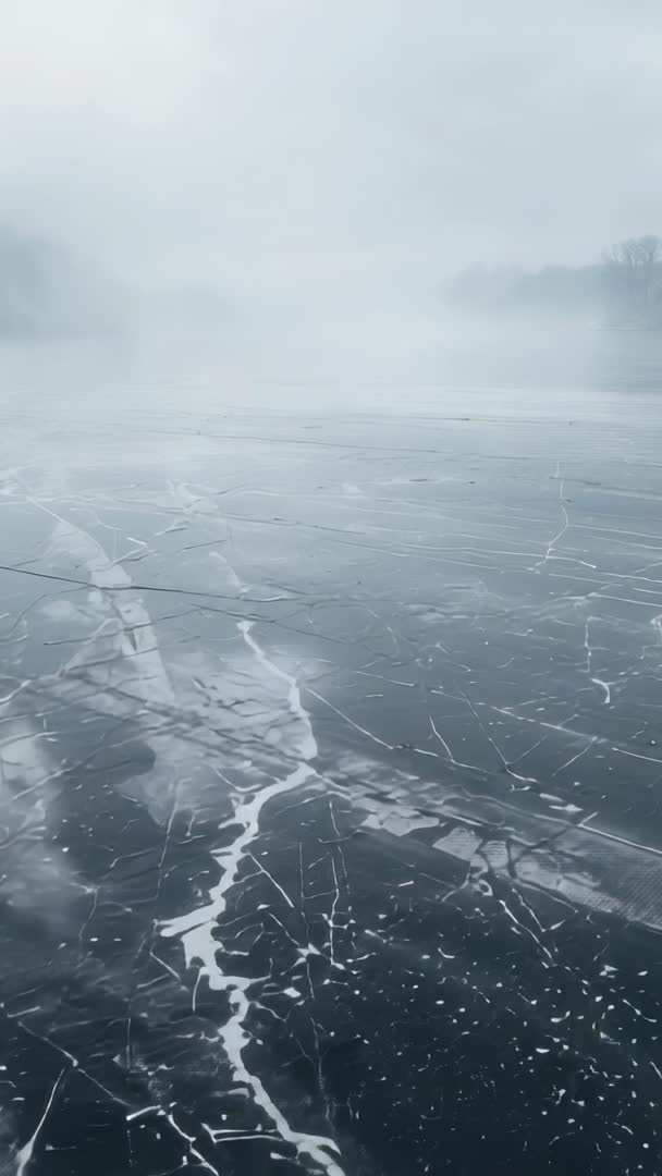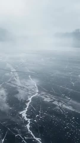 AI Generated Video. Vertical video showing sliding camera moving over frozen lake while revealing branching ice fissures and misty shoreline. Foreground displaying intricate network of white cracks and texture on dark icy surface. Background fading into cold fog with faint tree silhouettes and soft horizon. Color palette featuring cool blue-gray tones and high contrast linear patterns. Use for social media reels, smartphone wallpapers, website hero backgrounds, winter advertising, environmental storytelling, nature documentary b-roll, meditation and relaxation apps, and atmospheric title sequences. Suitable for vertical platforms like Instagram Reels, TikTok, mobile ad campaigns. Looping friendly when trimmed for seamless transition. Allow slow motion and subtle ambient sound design to enhance moody atmosphere. Provide room for overlaying text or logo in upper mist area for promotional or editorial use.