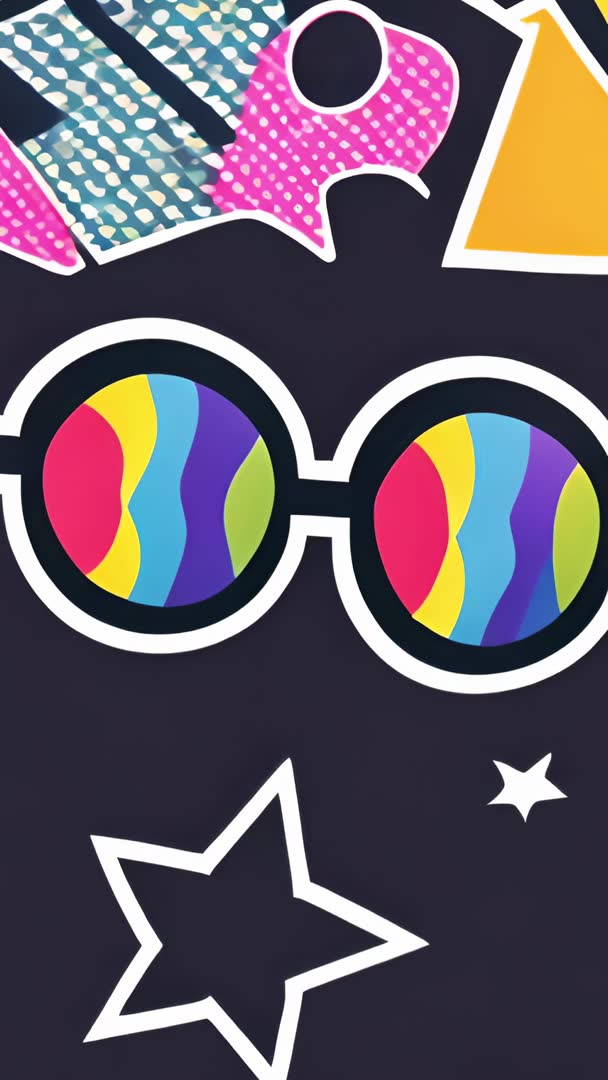 AI Generated Image. Vertical looping video showing sliding patches orbiting round glasses with rainbow lenses on dark purple canvas. Bold flat shapes and high contrast colors creating playful, cosmic mood. Perfect for social media stories, mobile wallpapers and vertical ads. Use for Instagram Reels, TikTok, YouTube Shorts, event intros, music visualizers, festival promos, fashion campaigns and kids content. Easy to loop for background motion, title card overlays or promotional bumpers. Ready for color grading and compositing with text and logos, ideal for fast-paced branding and vibrant motion design.