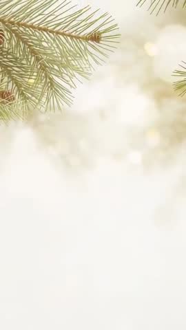 AI Generated Video. Vertical video clip showing pine branch sliding into frame from top-left, framing center with small cones and long needles, soft bokeh and warm golden glow creating tranquil mood. Spacious pale lower area leaving plenty of copy space for text, logos, titles or animated overlays. Working well for holiday social media stories, smartphone ads, seasonal greetings, greeting cards, website hero banners, product promotions, event invitations and background for quotes. Offering soft greens and warm gold tones for calming seasonal branding and minimal designs. Clip allowing slow motion or subtle parallax animations to add depth without distracting from content.
