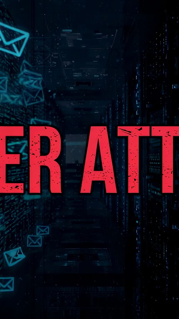 AI Generated Image. Vertical video showing sliding red alert banner moving through dark server corridor while blue envelope icons cascading down, signaling email intrusion and network compromise. Scene combining cinematic server room background with glitch-textured typography and neon email icons to convey urgency and threat. Ideal for cybersecurity campaign openers, incident response explainers, phishing awareness training, news segments about cyber attack, and app promo videos. Sized for vertical platforms including Stories, Reels, TikTok, and mobile ads. Loop-friendly segment for lower-thirds, title screens, social media ads, corporate security landing pages, and conference displays. Editable text and icon placement allowing brand customization and call-to-action overlays.