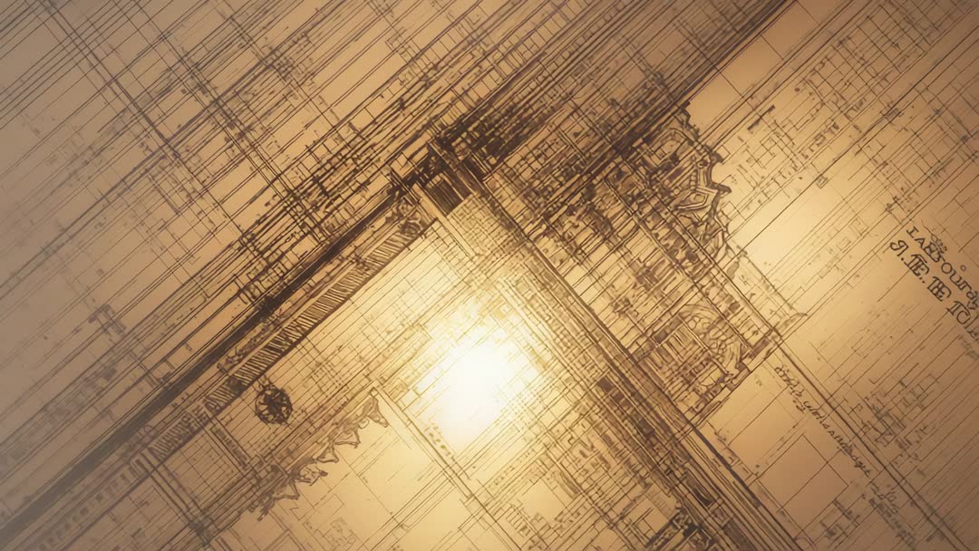 AI Generated Image. Pan-reveal footage showing sepia-toned architectural blueprint with precise linework, gridlines, and ornate cornice details. Central light flare traveling across parchment surface, adding cinematic highlight and depth while revealing labeled plan elements and decorative molding. Camera sliding movement creating sense of discovery and craftsmanship, suitable for opening sequences, architecture firm showreels, historical restoration documentaries, museum exhibition displays, online courses on architectural history, and design portfolio backgrounds. Easy to overlay with text, logo, or narration; compatible with editorial content, promotional spots, and social media clips. Adjustable color grading, vignette, and motion blur recommended to enhance vintage atmosphere and cinematic mood. Footage carrying AI-influenced visual treatment, ideal for concept reels, title animations, and presentation backdrops.